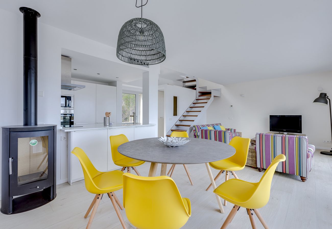 La cuisine américaine, à vitrocéramique, est équipée avec réfrigérateur, micro-ondes, four, congélateur, lave-vaisselle, vaisselle/couverts, ustensiles/cuisine, cafetière, grille pain et bouilloire.