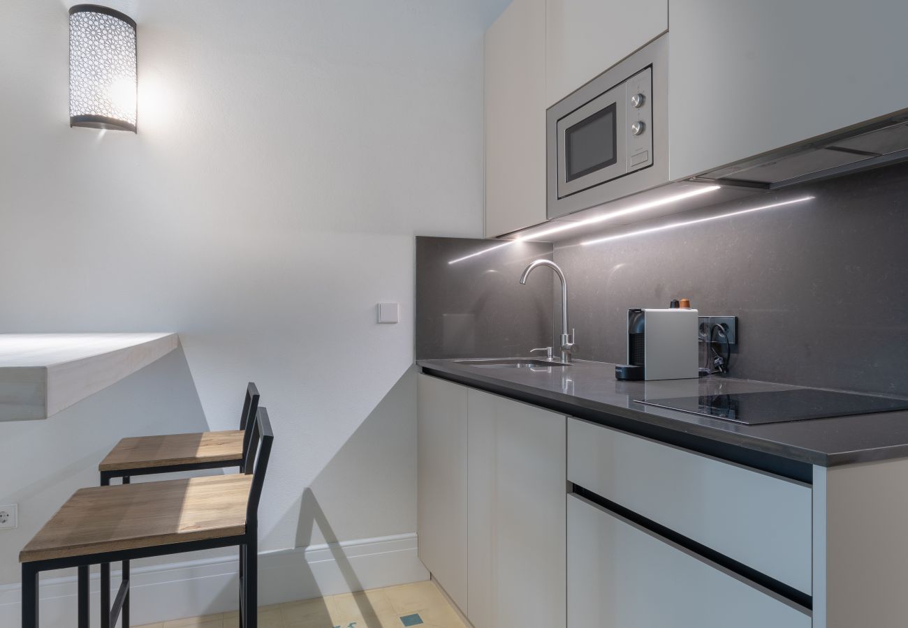 A kitchenette, de vitrocerâmica, está equipada com frigorífico, microondas, congelador, louça/talheres, utensílios/cozinha, máquina de café, torradeira, jarro eléctrico e máquina de sumos.