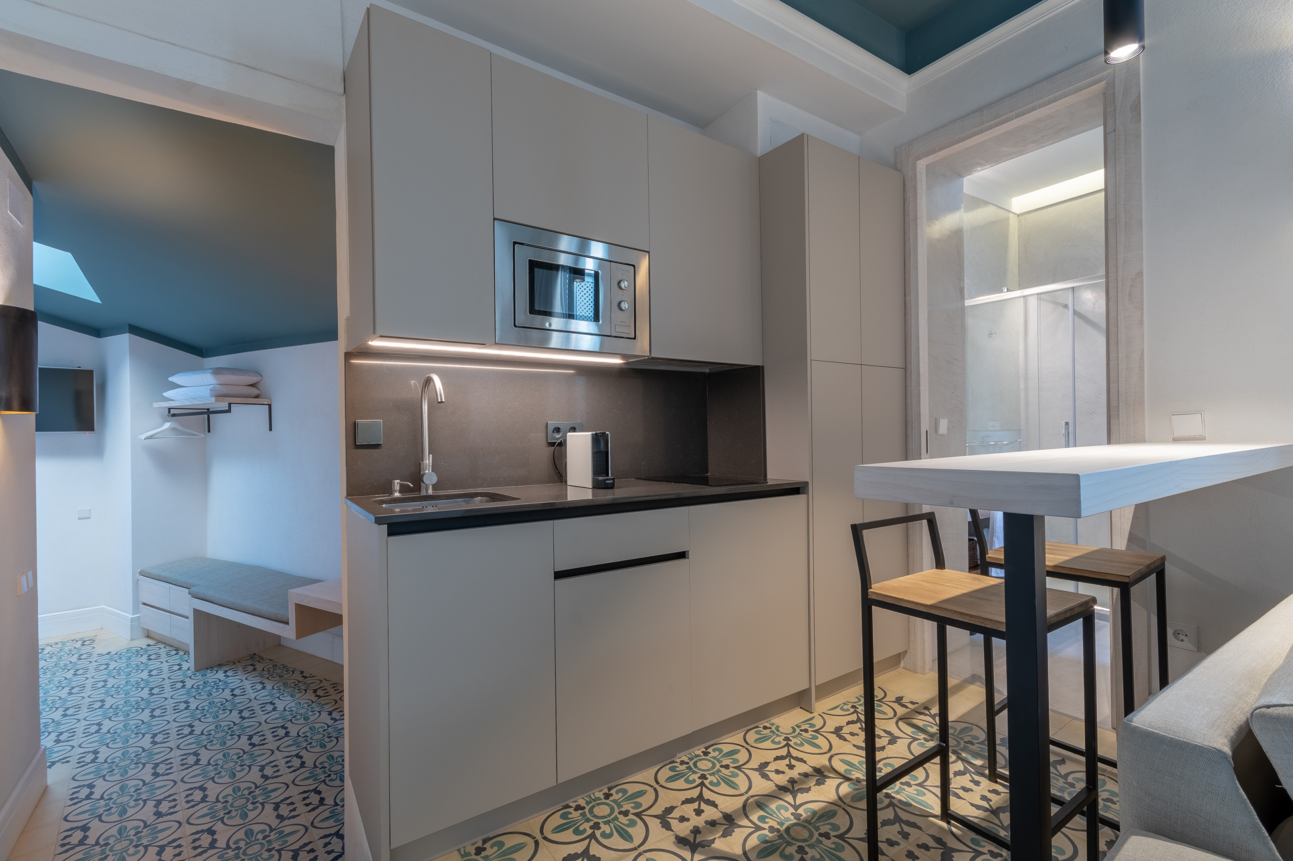 A kitchenette, de vitrocerâmica, está equipada com frigorífico, microondas, congelador, louça/talheres, utensílios/cozinha, máquina de café, torradeira, jarro eléctrico e máquina de sumos.